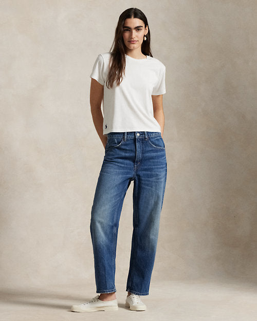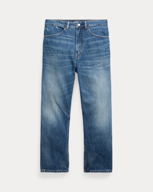 Ce jean fuselé décontracté de Ralph Lauren allie confort et style avec sa coupe moderne et son tissu de qualité. Confectionné en sergé de coton tissé de droite à gauche, il présente un délavage foncé avec une décoloration subtile au niveau des cuisses, offrant une allure à la fois chic et décontractée.
